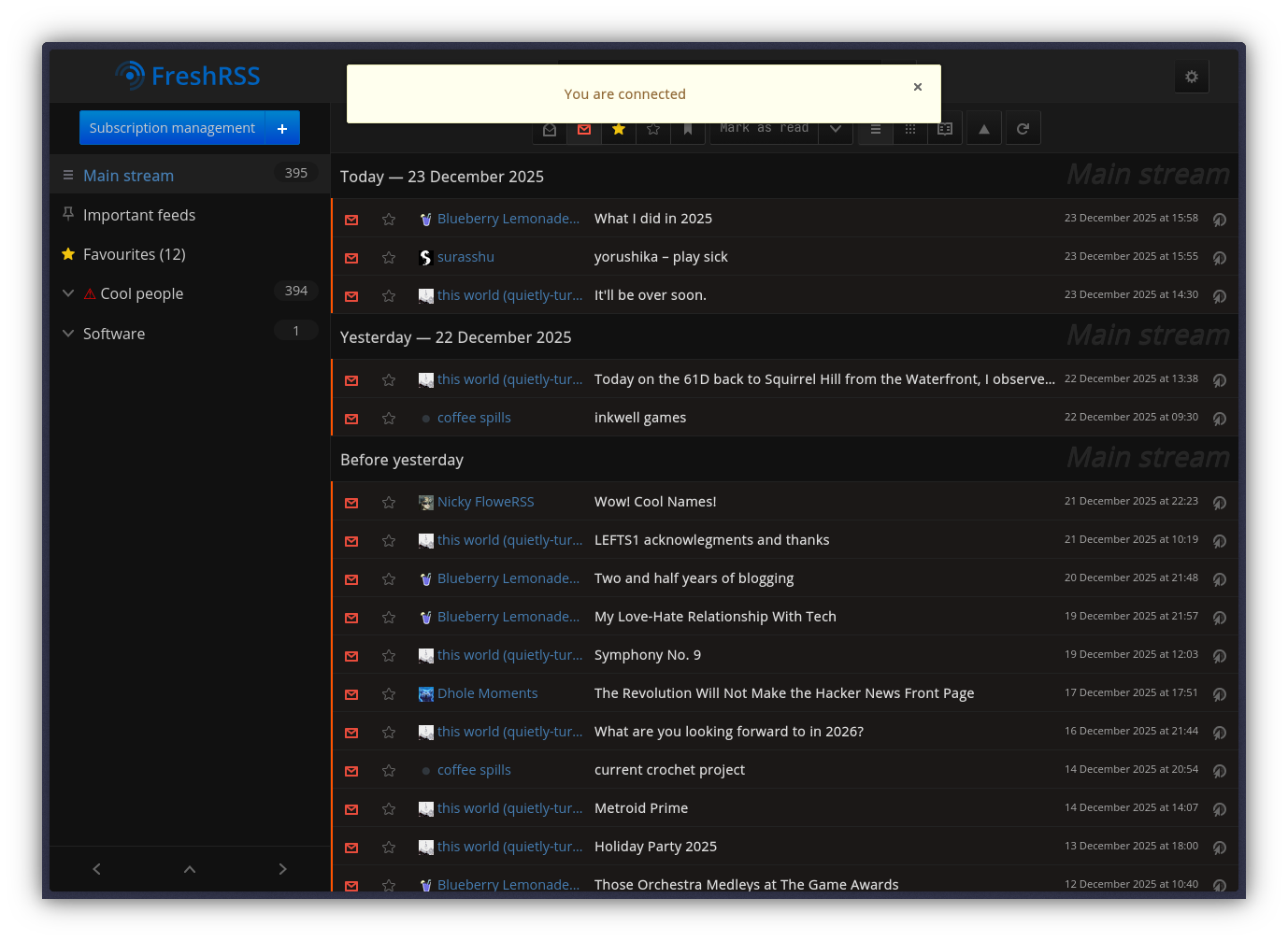 One of the other self-hosted pieces of software I use is FreshRSS, an RSS feed manager that interoperates with various other clients. I typically read it on my phone; there, I use the free, open-source, and ad-free(!) iOS app NetNewsWire. When I was still on Windows, I was happy with the Fluent Reader app. I haven't found a similarly polished client for Linux, but I'm not especially missing having a desktop solution. Some of my friends use the Firefox extension Feedbro and are happy with it.