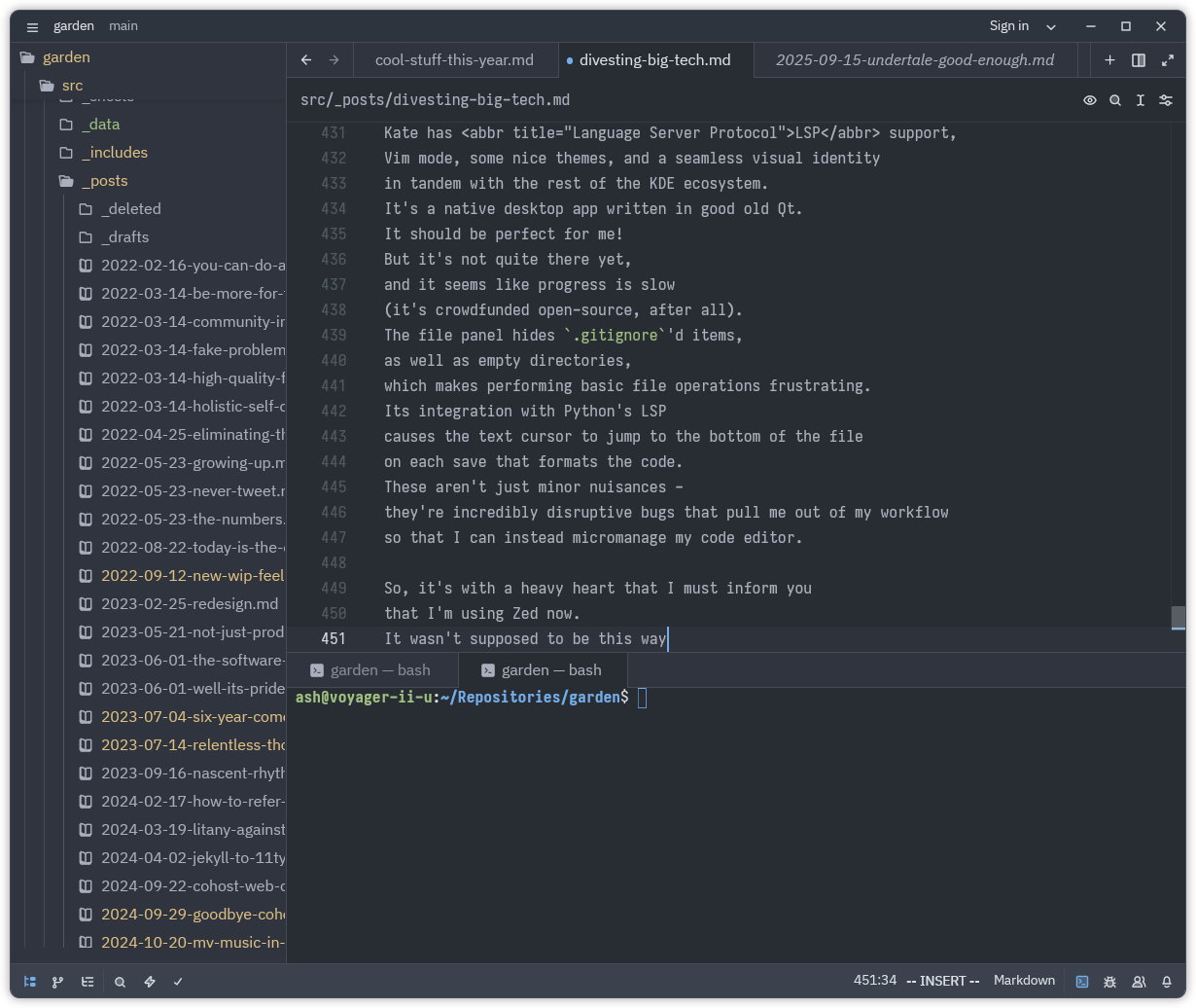 I wanted to tell you that I switched to Kate, KDE's in-house editor. Kate has LSP support, Vim mode, some nice themes, and a seamless visual identity in tandem with the rest of the KDE ecosystem. It's a native desktop app written in good old Qt. It should be perfect for me!