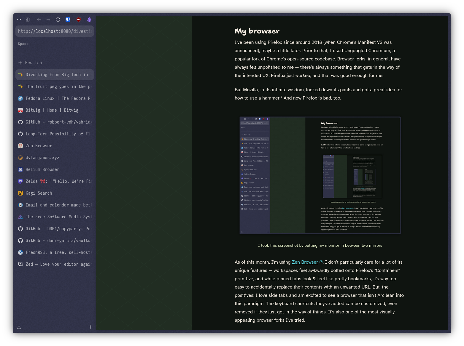 As of this month, I'm using Zen Browser. I don't particularly care for a lot of its unique features β€” workspaces feel awkwardly bolted onto Firefox's "Containers" primitive, and while pinned tabs look & feel like pretty bookmarks, it's way too easy to accidentally replace their contents with an unwanted URL. But, the positives: I love side tabs and am excited to see a browser that isn't Arc lean into this paradigm. The keyboard shortcuts they've added can be customized, even removed if they just get in the way of things. It's also one of the most visually appealing browser forks I've tried.